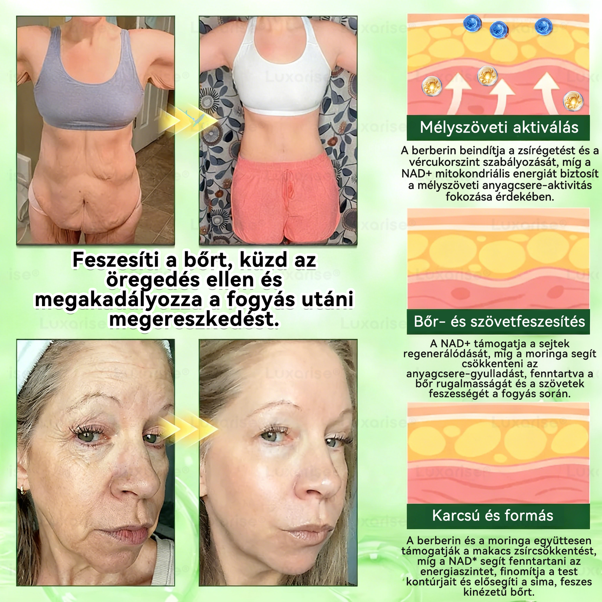 A formulĂĄt NAD+ egĂ©szĂti ki, amely a testsĂșlyvĂĄltozĂĄsok sorĂĄn tĂĄmogatja a bĆr feszessĂ©gĂ©t Ă©s szerkezeti ellenĂĄllĂł kĂ©pessĂ©gĂ©t, hozzĂĄjĂĄrulva a karcsĂș megjelenĂ©s megĆrzĂ©sĂ©hez anĂ©lkĂŒl, hogy a komfortĂ©rzetet vagy az esztĂ©tikĂĄt csökkentenĂ©. TovĂĄbbi, nagy hatĂ©konysĂĄgĂș összetevĆk segĂtik az immunrendszer mƱködĂ©sĂ©t, az emĂ©sztĂ©s egĂ©szsĂ©gĂ©t, a bĂ©lflĂłra egyensĂșlyĂĄt, a nĆi egĂ©szsĂ©get, a napi energiaszint növelĂ©sĂ©t Ă©s a fĂĄradtsĂĄg csökkentĂ©sĂ©t, ezĂĄltal belĂŒlrĆl tĂĄmogatva egy fiatalosabb Ă©s ellenĂĄllĂłbb szervezeti ĂĄllapotot.